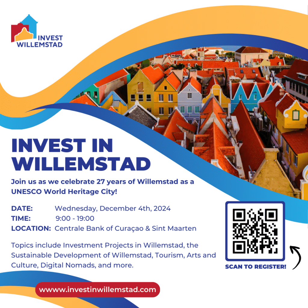 This 6th edition of Invest in Willemstad celebrates 27 years of UNESCO World Heritage status and focuses on sustainable investments in Willemstad. Programma Invest in Willemstad Click the LINK or scan the QR code to register now! Don’t miss the opportunity to be part of inspiring conversations and a day of celebration.